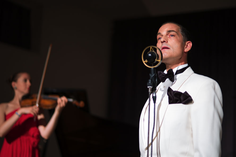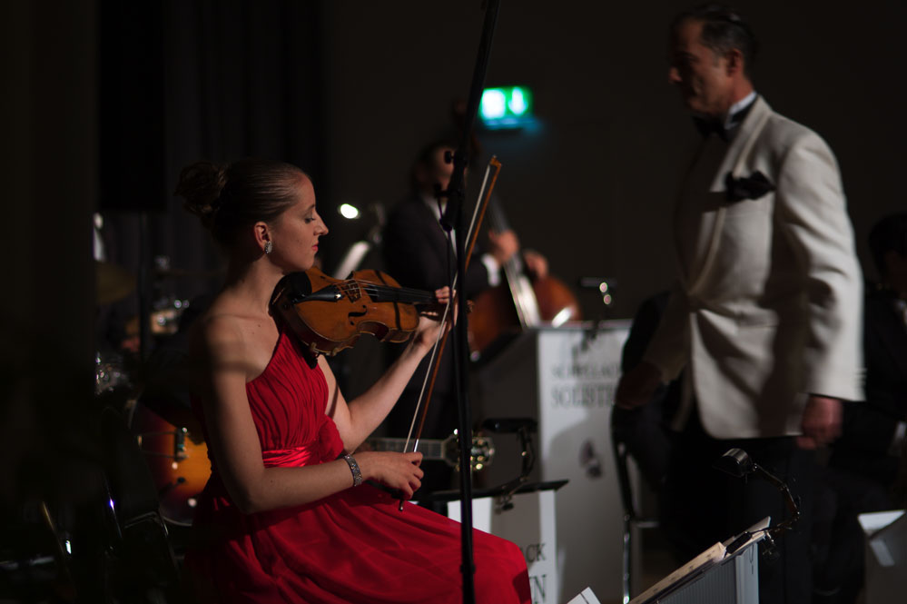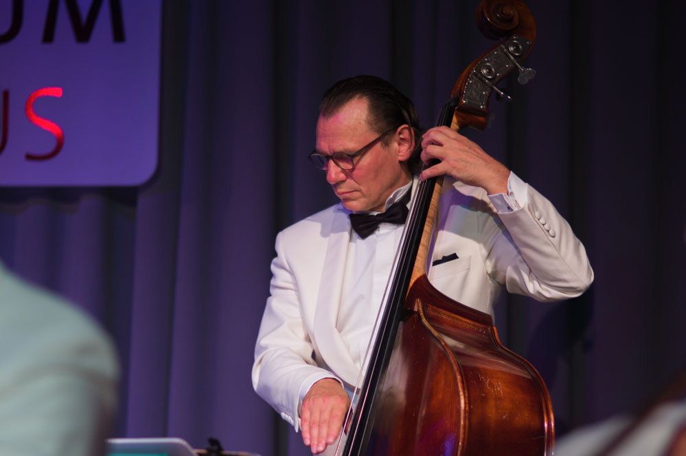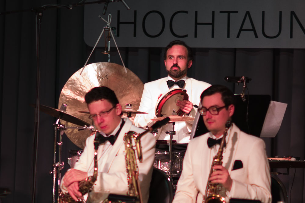 Doch zurück zum Anfang. Mit „Weißt Du, was Du kannst“ von Austin Egen (1897-1941) ging es im Stil der Comedian Harmonists los. Und im selben Stil wechselten die Schellack-Solisten zu „Skandal im Sperrbezirk“ der Spider Murphy Gang aus dem Jahr 1981. Frontmann Denis Wittberg übernahm nicht nur den Gesang, er hatte auch die schwere Aufgabe, das gesamte Konzert lang den unnahbaren Gentleman zu spielen, wie man sich ihn aus der Schellack-Zeit vorstellt: Stocksteif und mit fast ausdruckslosem Gesicht, das sich nur hin und wieder dazu hinreißen ließ, eine Augenbraue hoch zu ziehen. Dem Orchester war die Begeisterung am Spiel und den netten Zwischeneinlagen anzumerken. So war der Posaunist auch der Mann mit dem Revolver in einem Titel von 1930, in dem es um einen Geräuschemacher beim Film ging.