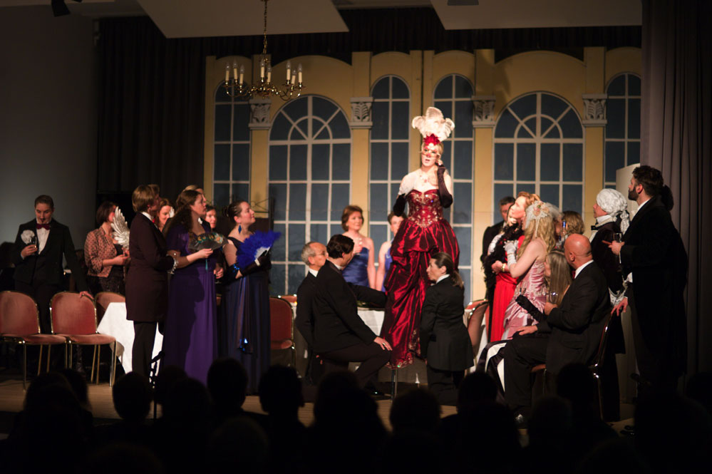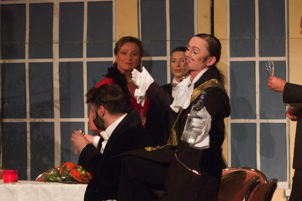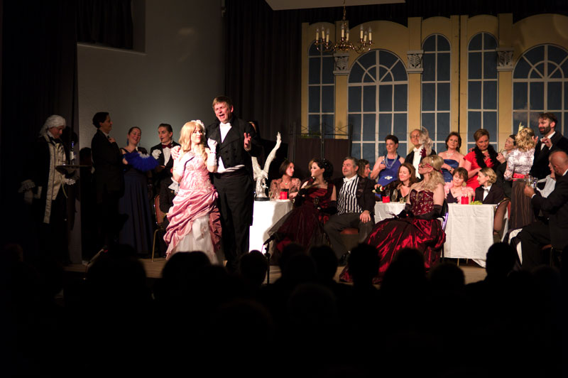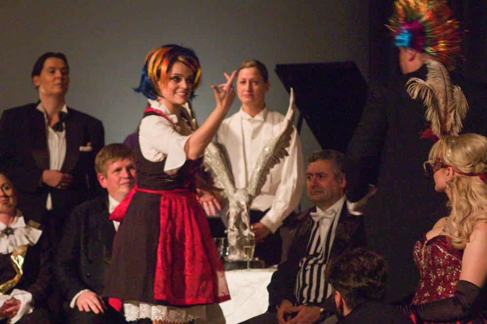 Unter der Regie von Lucy Snyder gab das Ensemble nicht nur gesanglich sein Bestes. Auch das Schauspiel passte. Während im Vordergrund Prinz Orlofsky bekannt gab, „Ich lade gern mir Gäste ein“, bildete der Chor das Bankett, prostete sich zu und „plauderte“ miteinander. Und während der Auftritte für seine Gäste spielte der Prinz absolute Langeweile mit zeitweisem Einnicken.