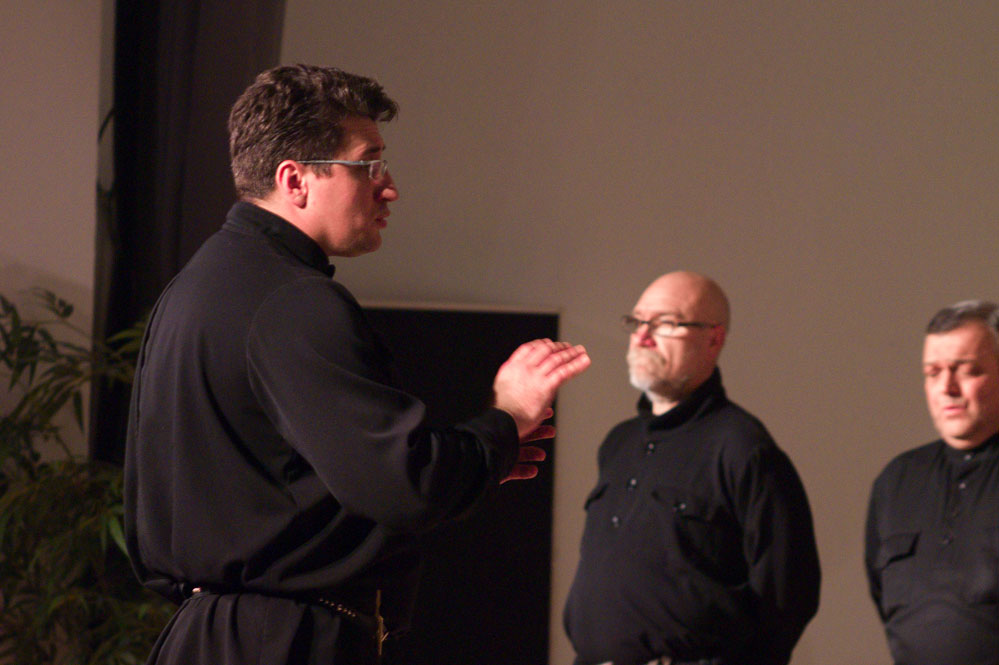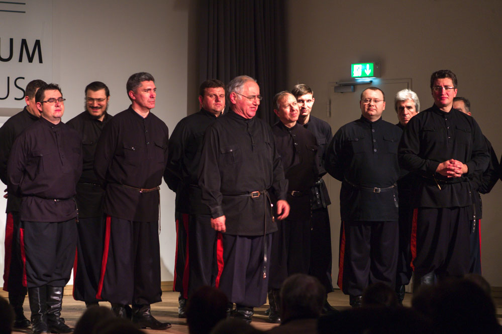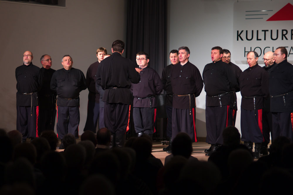 18 Männer im schwarzen Hemd, den Gürtel fest unter dem Bauch zugezogen, die Hosenbeine in die schweren Lederstiefel gesteckt, standen mit auf dem Rücken verschränkten Händen im Halbkreis und boten im ersten Teil ausdrucksstarke liturgische Gesänge der russisch-orthodoxen Kirche. Die „Große Bitt-Litanei mit „Vater unser“, „O bete Freund“ und auch „In dulce jubilo“ zelebrierten die Sänger mit regungslosen Gesichtern, dafür mit Stimmen wie aus einer anderen Welt. Das Atmen schien ihnen nicht mehr nötig zu sein, so lange hielten sie die Töne, ließen sie leise und sanft im Saal umherschwirren, um dann ganz langsam an Intensität und Tempo zuzunehmen und auf das fulminante Ende zuzusteuern. Die Klangfarben von hell bis dunkel verschwammen in Harmonien und konnten dennoch exakt herausgehört werden.