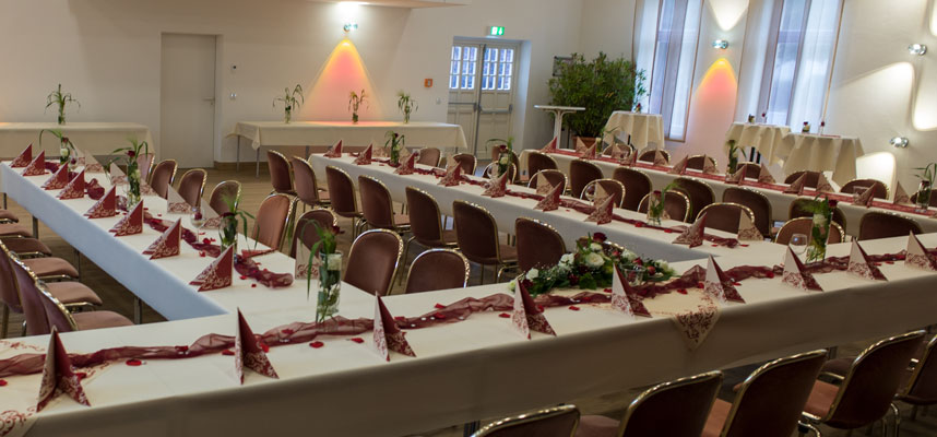 Dabei eignet sich der Saal dank der flexiblen Trennwände ideal sowohl für große Feste als auch kleine Feierlichkeiten. Ihrer Kreativität sind dabei praktisch keine Grenzen gesetzt: Passend zum Anlaß können Sie zwischen robusten und eleganten Polsterstühlen wählen und die Ausstattung des Raumes an den Charakter Ihrer Feier anpassen.