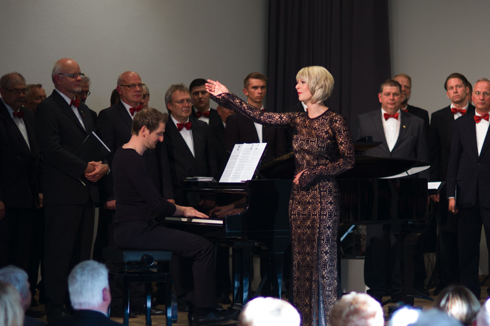 Wer Geburtstag feiert, wird gerne beschenkt. Beim MGV Liederkanz war es am Sonntag zur besten Kaffeezeit andersherum. Der Verein, der 130 Jahre Zusammensein feiern darf, gab den Gästen etwas, nämlich Gesang vom Feinsten. Zunächst zeigten die Geburtstagskinder selbst, zu was sie stimmlich fähig sind. „Ihr Freunde seid gegrüßt“ lautete die musikalische Begrüßung. Im Wechsel mit der erst 26-jährigen Sopranistin, die von Marcus Gemeinder am Klavier begleitet wurde, duellierten sich die Gesangseinlagen beinahe, und man konnte nicht sagen, auf wen man sich mehr freute – auf die Herren in Schwarz oder die Lady in Red. Absoluter Höhepunkt des ersten Teils war dann Jessica Fründ und ihre Darbietung von „Moon River“ aus dem Film „Breakfast at Tiffany’s“, zu dem sie das rote Etwas zugunsten eines dunklen Spitzentraums wechselte. Ohne Zugabe ging da gar nichts. Mit dem Titel „Somewhere“ aus der West Side Story setzte Jessica Fründ dann noch einen drauf, was ihr nicht nur tosenden Applaus, sondern jede Menge Ohs und Ahs einbrachte.