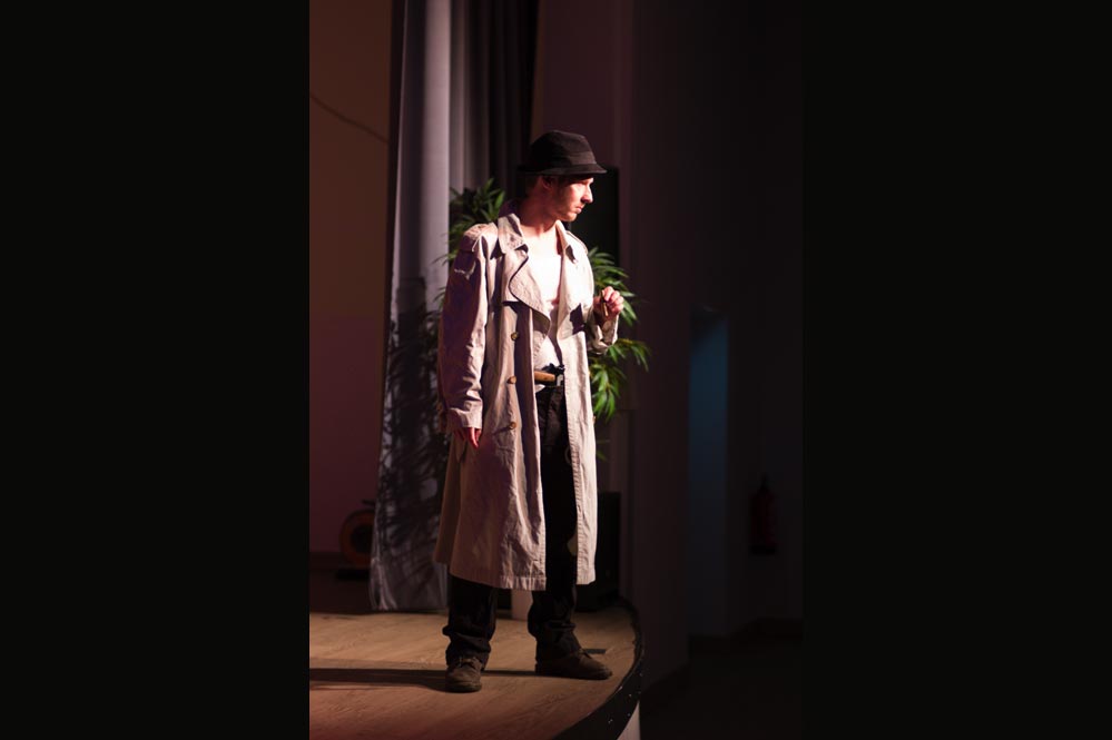 Als Kai Gemeinder dann als Kommissar Karlheinz Bogart mit Trench und Pistole auf die Bühne kommt, braucht er nicht mehr lange, um das Publikum auf seine Seite zu ziehen. Und nach seinem Bericht über die verlorene Freundin und den Mitleidsbekundungen aus dem Publikum ist das dickste Eis gebrochen.
