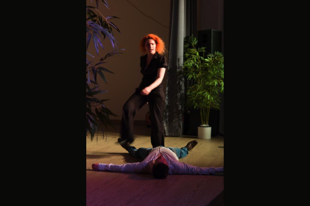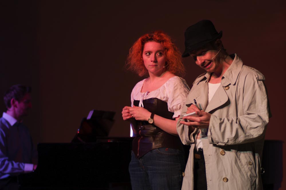 Als Verdächtige oder Zeugin, je nach Bedarf, trat Valeska Judisch auf, die mit gekonnt russischem Akzent das Lied „Stroganoff“ von Friedrich Hollaender intonierte. Oder als Frau eines Mörders beklagte: „Ach, Erich, warum bin ich dir hörig“. Und ihm half, die Leichen zu beseitigen. Mit bitterbösem schwarzen Humor kam das Duett der beiden Sägebegeisterten daher: „Du wirst nie von mir gehen, wenn beide Beine fehl’n“. Makaber-fröhlich gingen sie anschließend „Tauben vergiften im Park“.