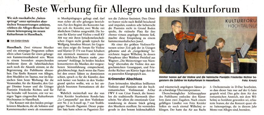 „Ein Konzert im Rohbau hat doch auch was“, scherzte Veranstalter Karl-Werner Joerg im brandneuen „Kulturforum Hochtaunus“ bei der Begrüßung zum fünften Konzert des Festivals Allegro: Dimiter Ivanov, Konzertmeister beim Frankfurter Museumsorchester, und die Usinger Pianistin und künstlerische Leiterin von Allegro, Friederike Richter, spielten Kammermusik von Mozart, Wilhelmj, Schubert, Paganini und Franck.