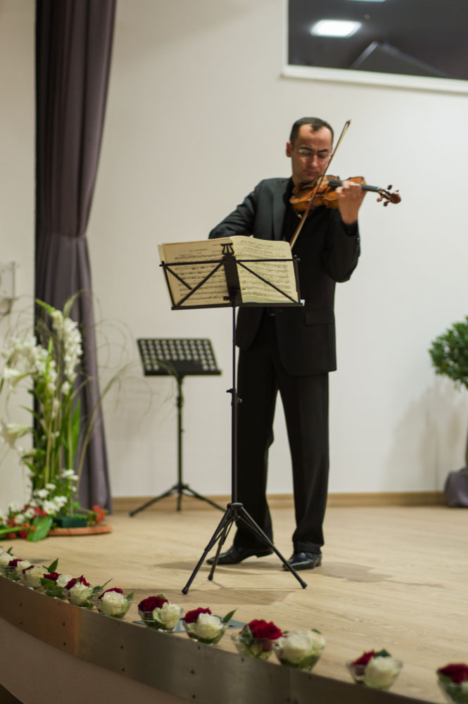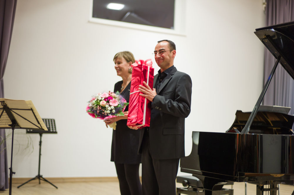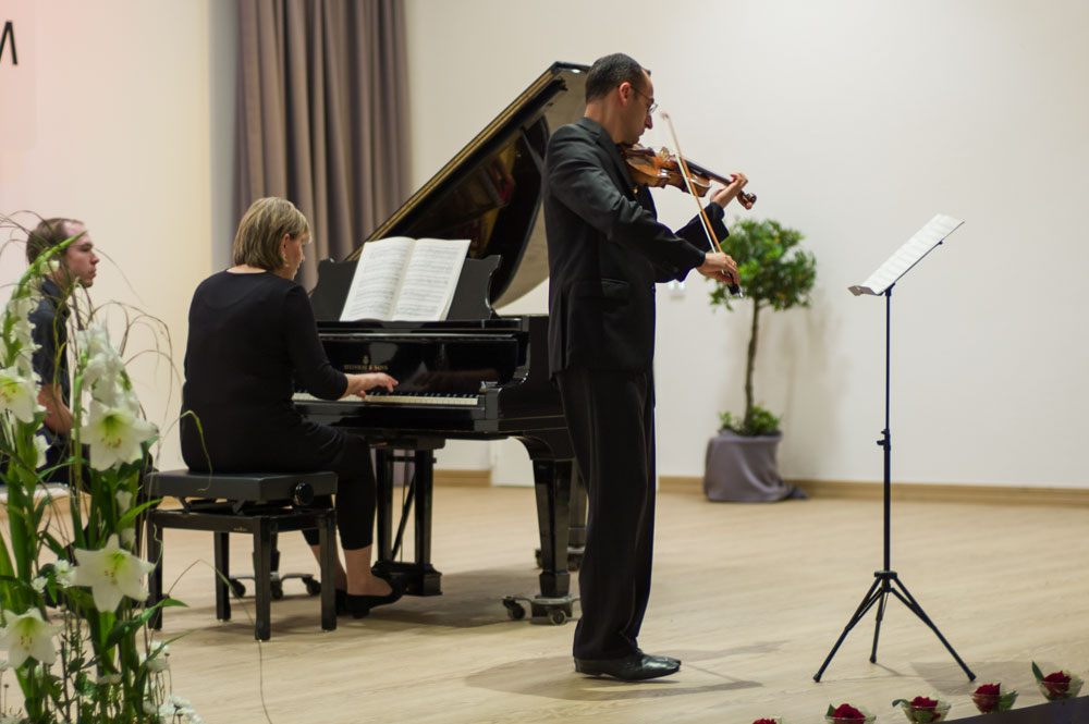 Mit der „Sonate für Klavier und Violine e-Moll KV304“ von Wolfgang Amadeus Mozart (1756-1791) begannen Richter und Ivanov, die zum ersten Mal gemeinsam auftraten. „Mozart ist für Dilettanten zu leicht und für Berufsmusiker zu schwer“, hatte der Pianist Artur Schnabel einmal bemerkt. In der Tat sind gerade bei diesem Komponisten selbst kleinste Ungenauigkeiten überdeutlich hörbar. Der Vortrag der beiden Musiker war dagegen absolut überzeugend. Ivanovs warmen, strahlenden Violinenklang stand Richters sensibler – und wo es nötig war, auch mal zupackender Anschlag – gegenüber. Der war auf dem Steinway-A Flügel selbst im Forte nie zu hart, nie klirrend, aber dafür klangreich und „tief.“ Aufmerksam stellte Richter auch den gemeinsamen, absolut präzisen Gleichklang her, denn Ivanov konnte die Pianistin aufgrund seiner dem Publikum zugewandten Position nicht sehen.